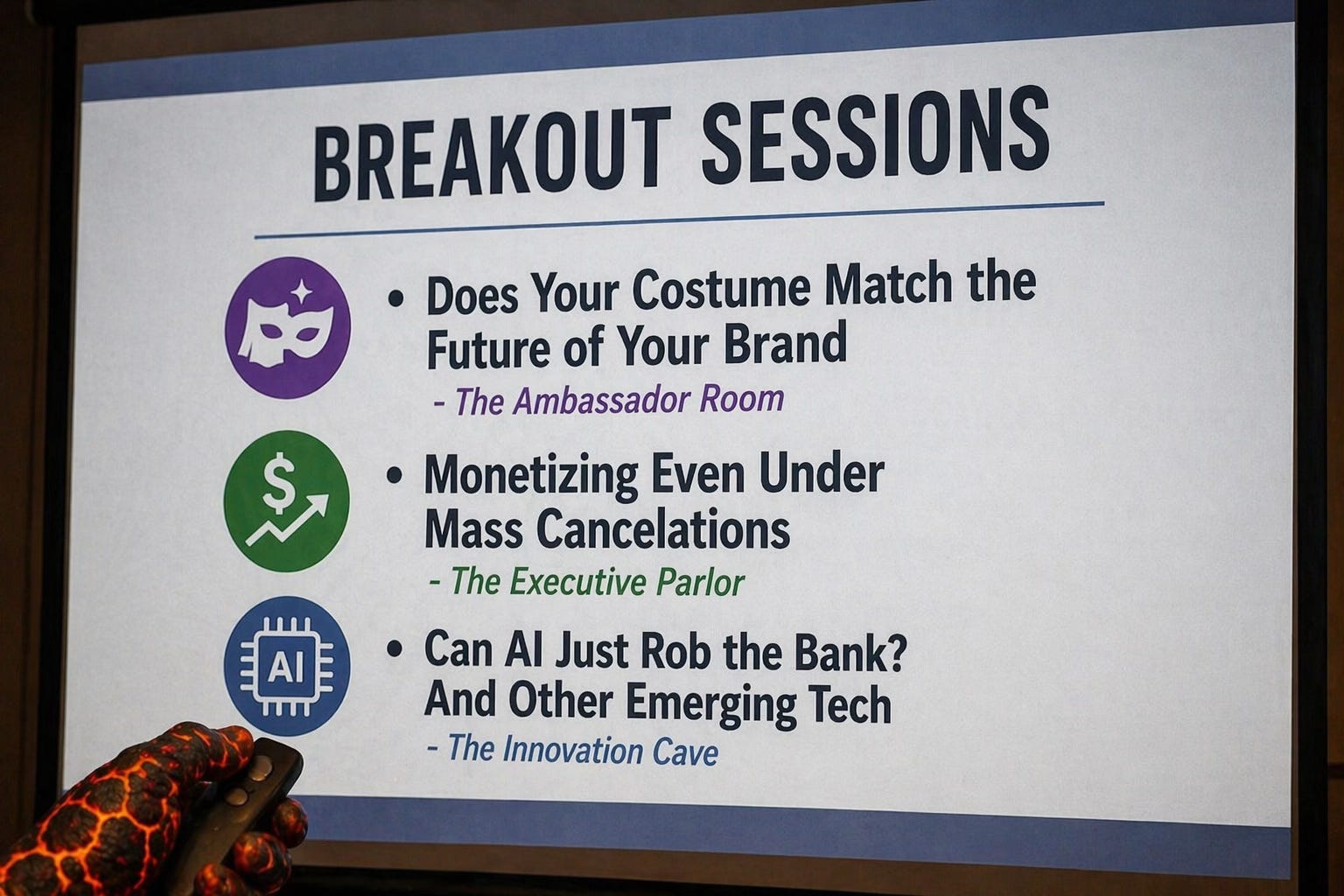 Volcanic Ash clicked to the next slide. “Alright. Breakout sessions are divided by room.”