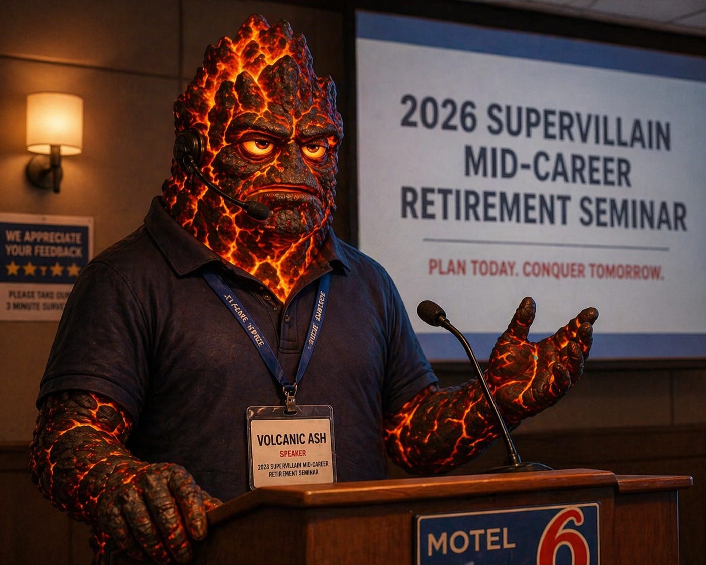 “Welcome everyone to the 2026 Supervillain Mid-Career Retirement Seminar.”